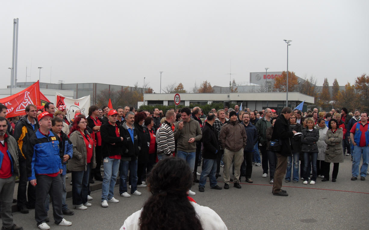 "Das bisherige Angebot der Arbeitgeber "ist eine unverschämte Provokation und eine Beleidigung", sagte Helga Schwitzer, Geschäftsführendes Vorstandsmitglied der IG Metall in ihrer Rede vor 400 Warnstreikenden der Firma