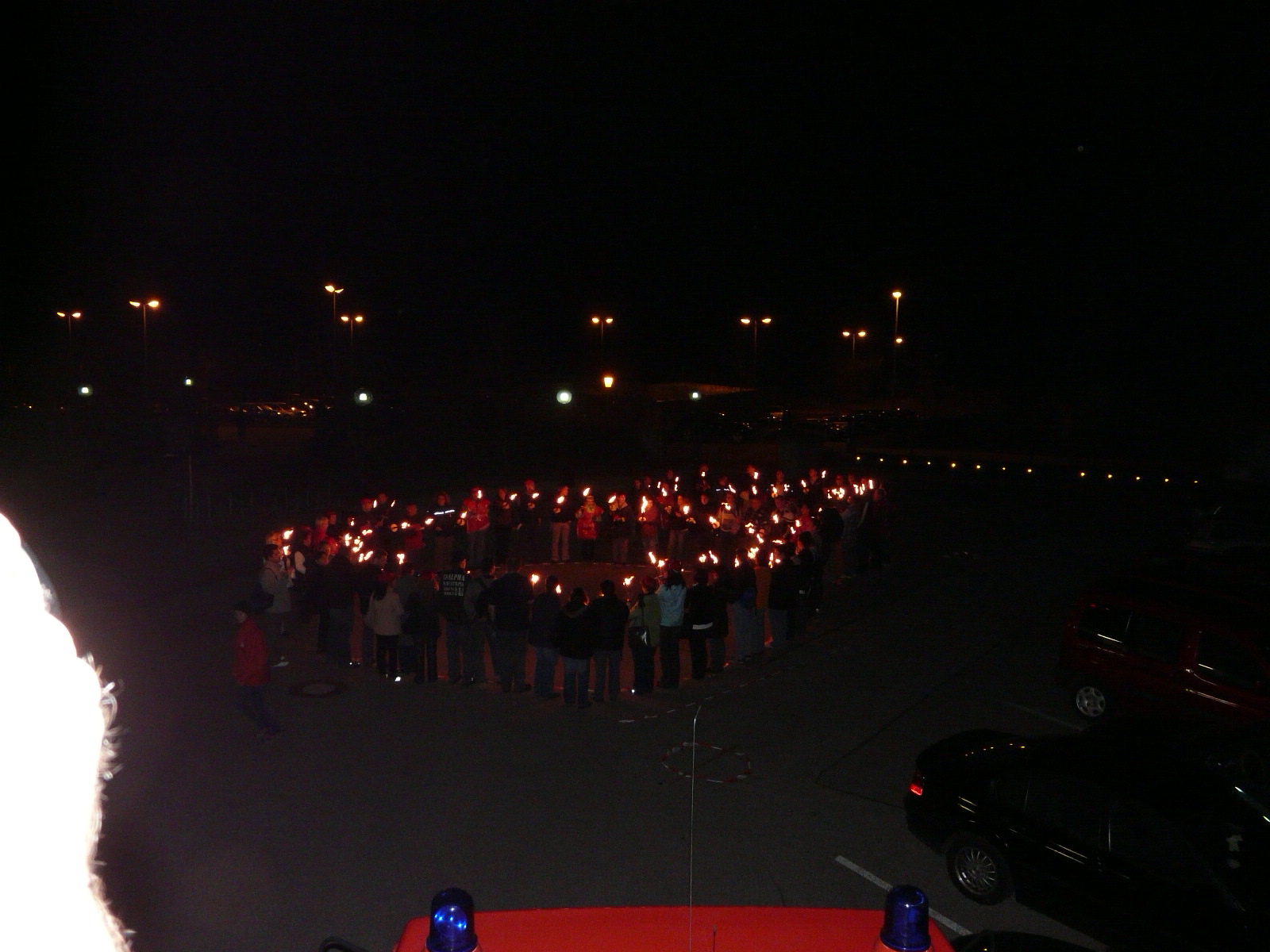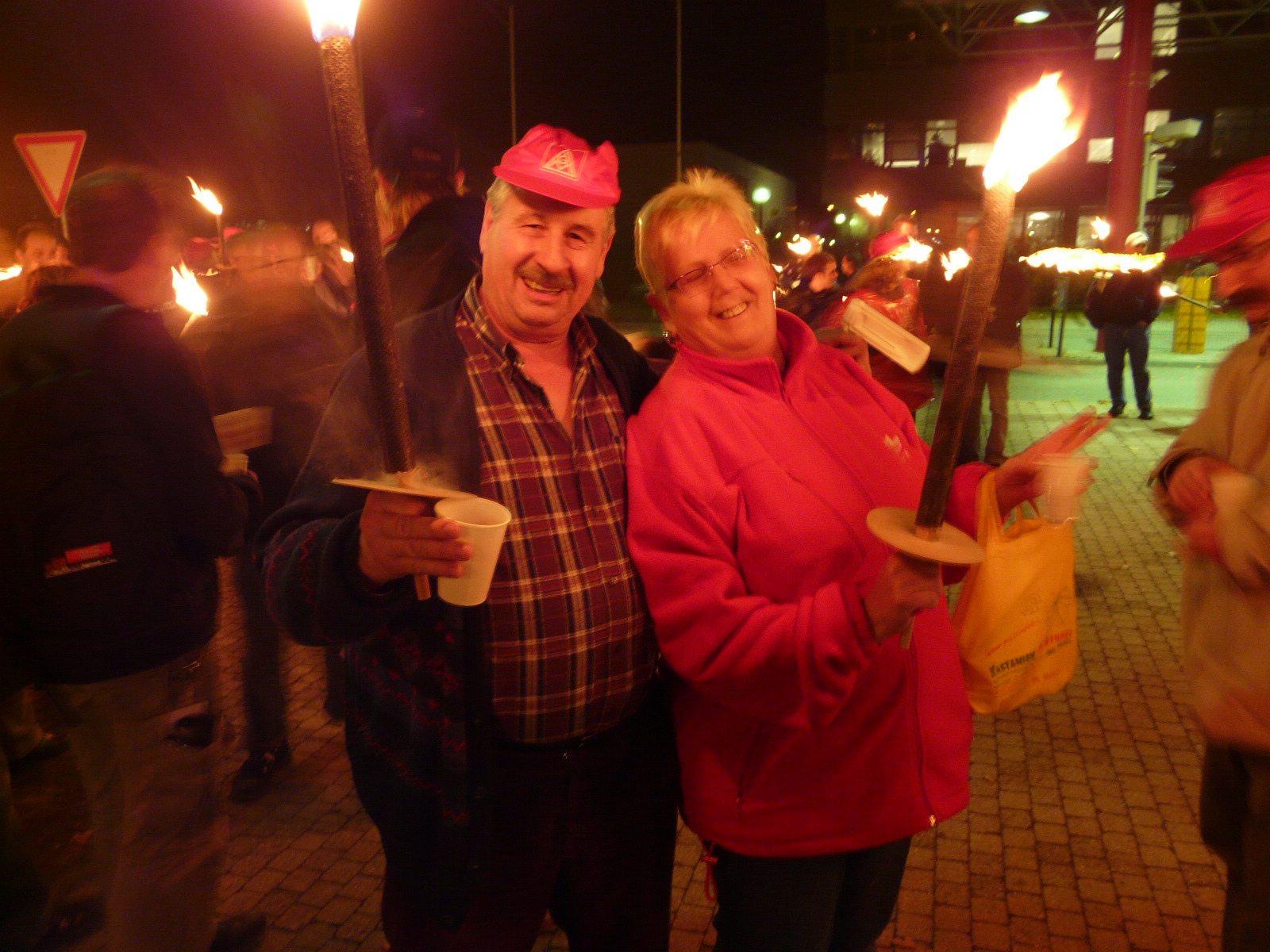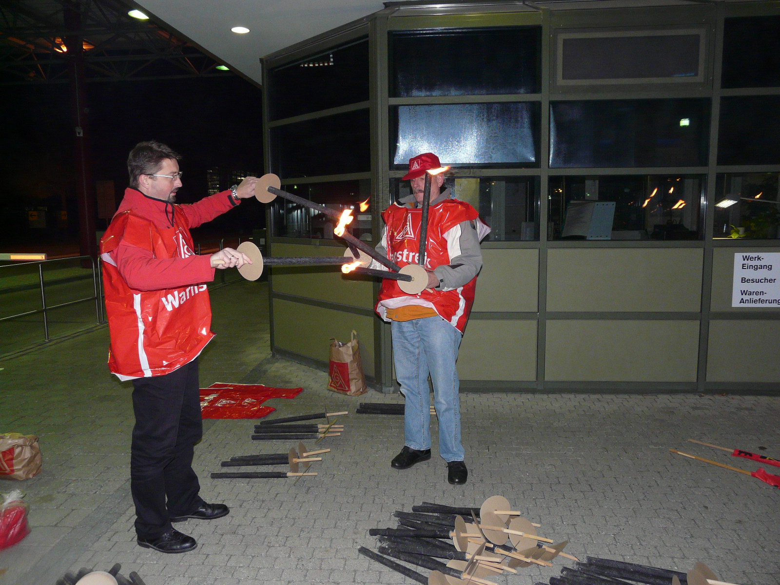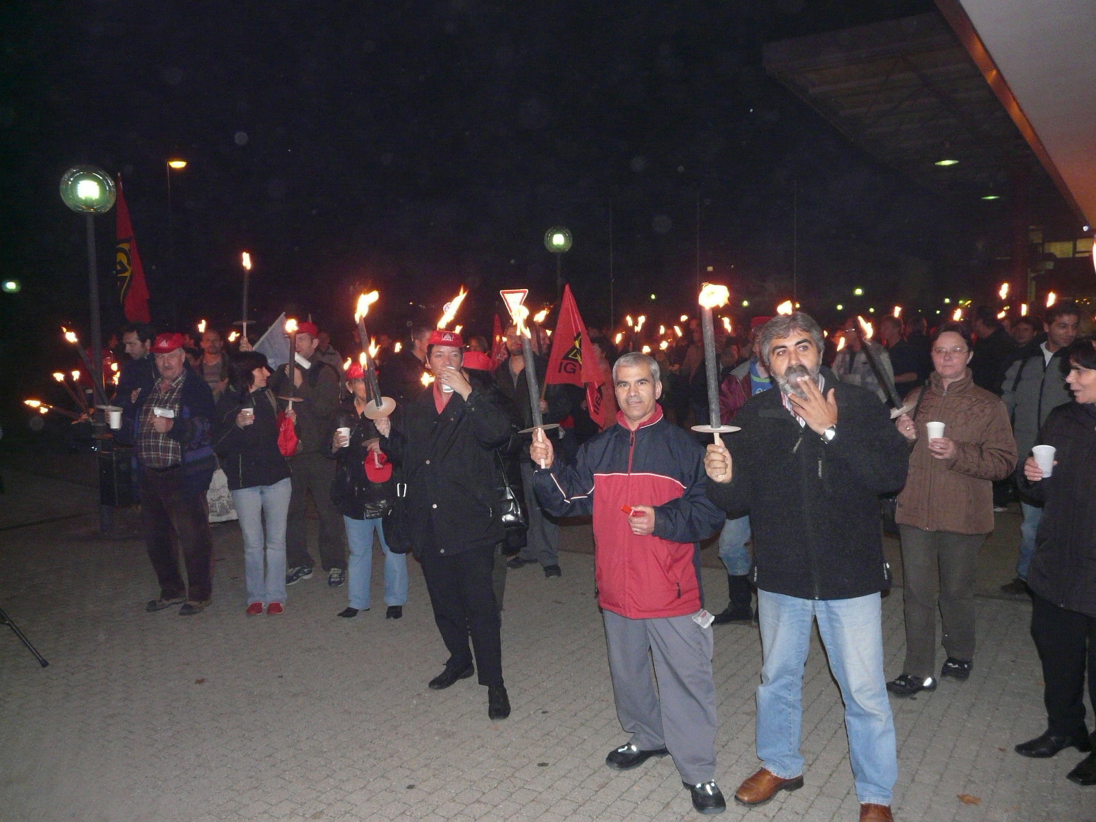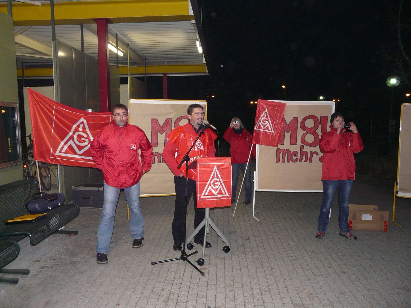 Mit Fackeln formierten sie sich die Streikenden zu einer Acht, um ihrer Forderung nach acht Prozent mehr Lohn Nachdruck zu verleihen. Die Arbeitgeber haben 2,1 Prozent Einkommenserhöhung und eine Einmalzahlung von 0,8 Prozent angeboten. Das ist das gleiche wie wenn ich einem Magersüchtigem Menschen ein Abmagerungsprogramm vorlege, betonte Carlos Gil von der Verwaltungsstelle der IG-Metall Kempten. Darauf werden wir uns nicht einlassen. Die Schicht wurde dann mit einem Frühschluss beendet. In der darauffolgenden Woche ist noch ein weiterer Warnstreik geplant.