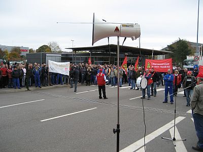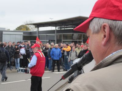 Vor der eindrucksvollen Versammlung spricht Werner Cappel, 1. Bevollmächtigter der IG Metall Verwaltungsstelle Homburg-Saarpfalz: "Die Alten können nicht bis 67 arbeiten und die Jungen brauchen ihre Jobs".