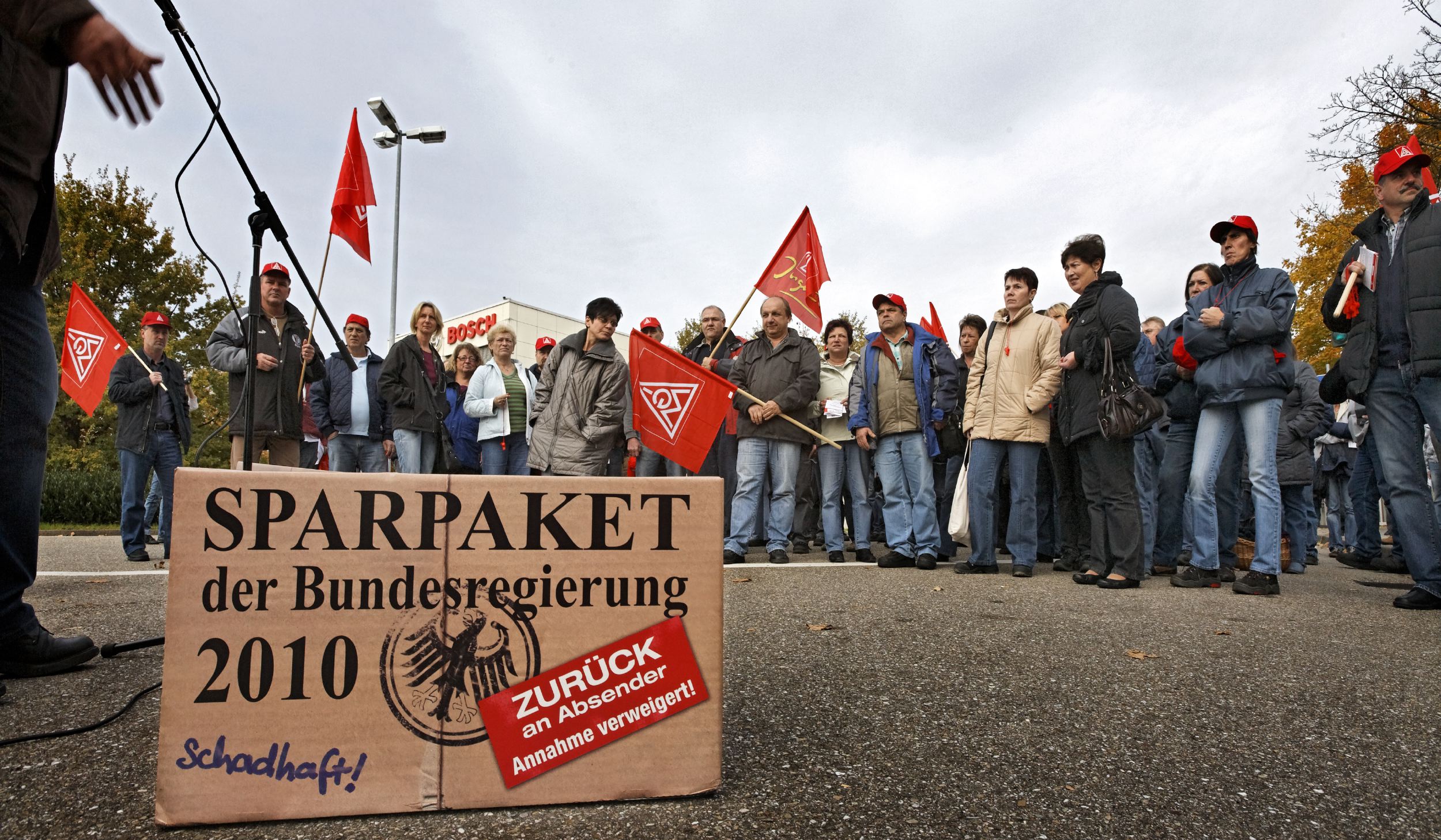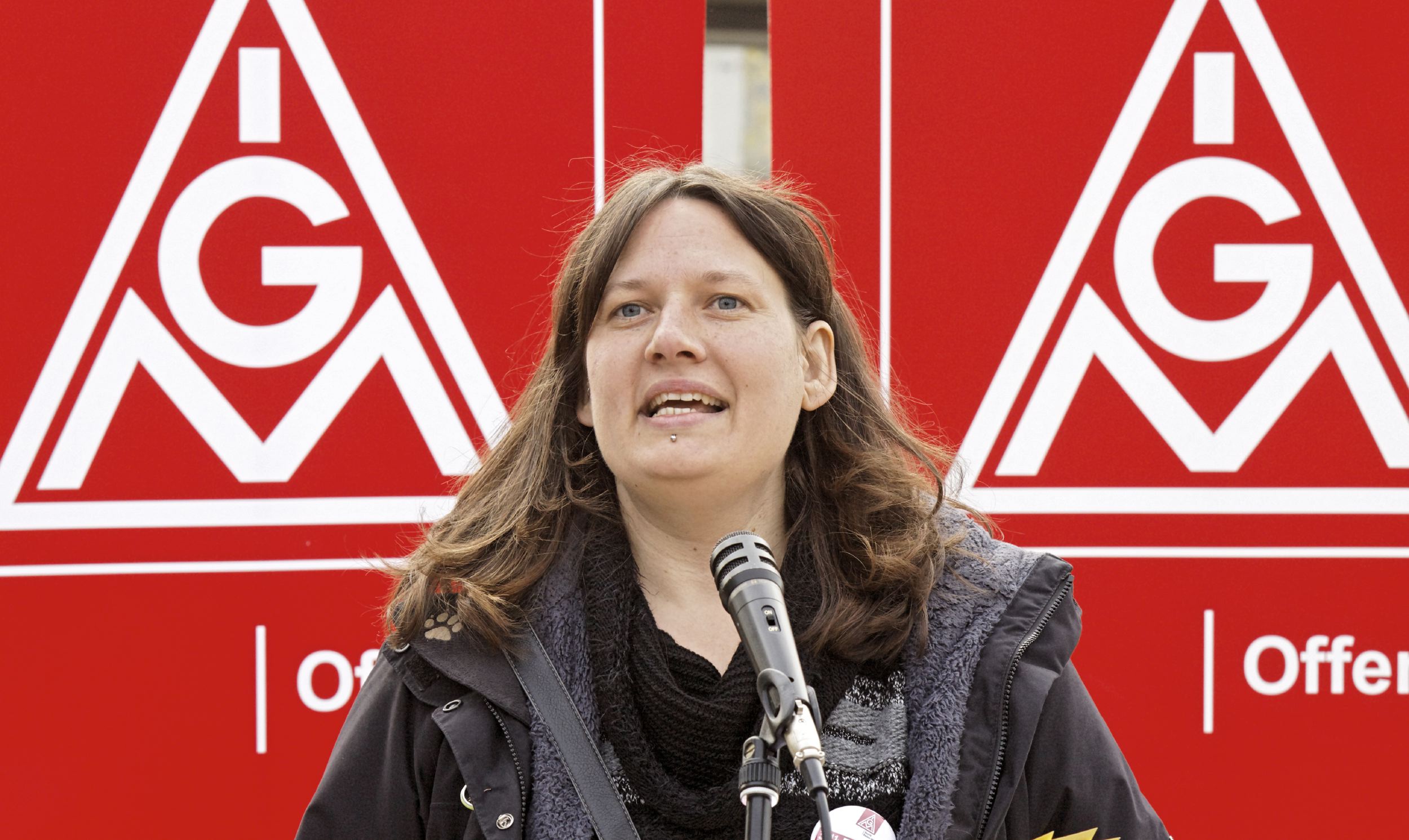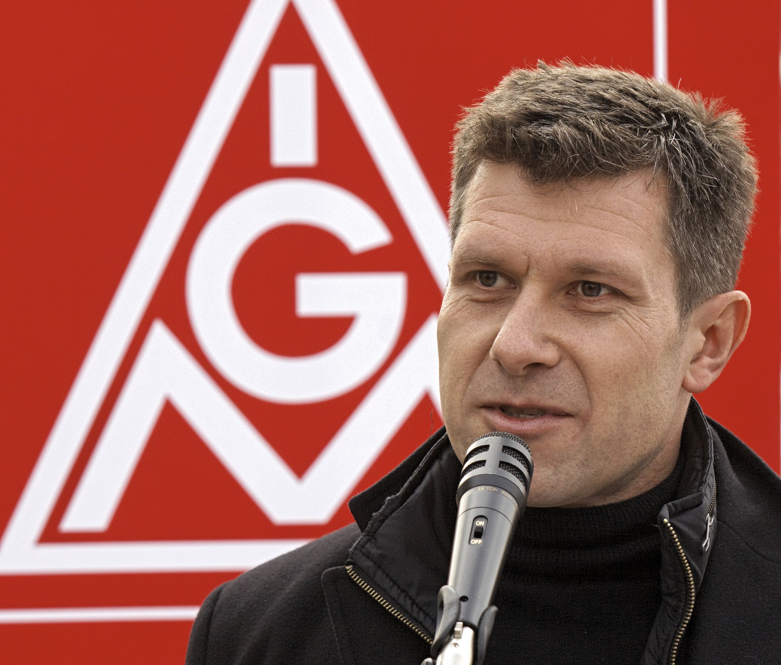 Vor mehreren 100 Beschäftigten spricht Kai Bliesener, Pressesprecher der IG Metall Bezirksleitung Baden-Württemberg. Er fordert die Regierung auf, die Verursacher der tiefsten Krise des Jahrzehntes zur Kasse zu bitten.