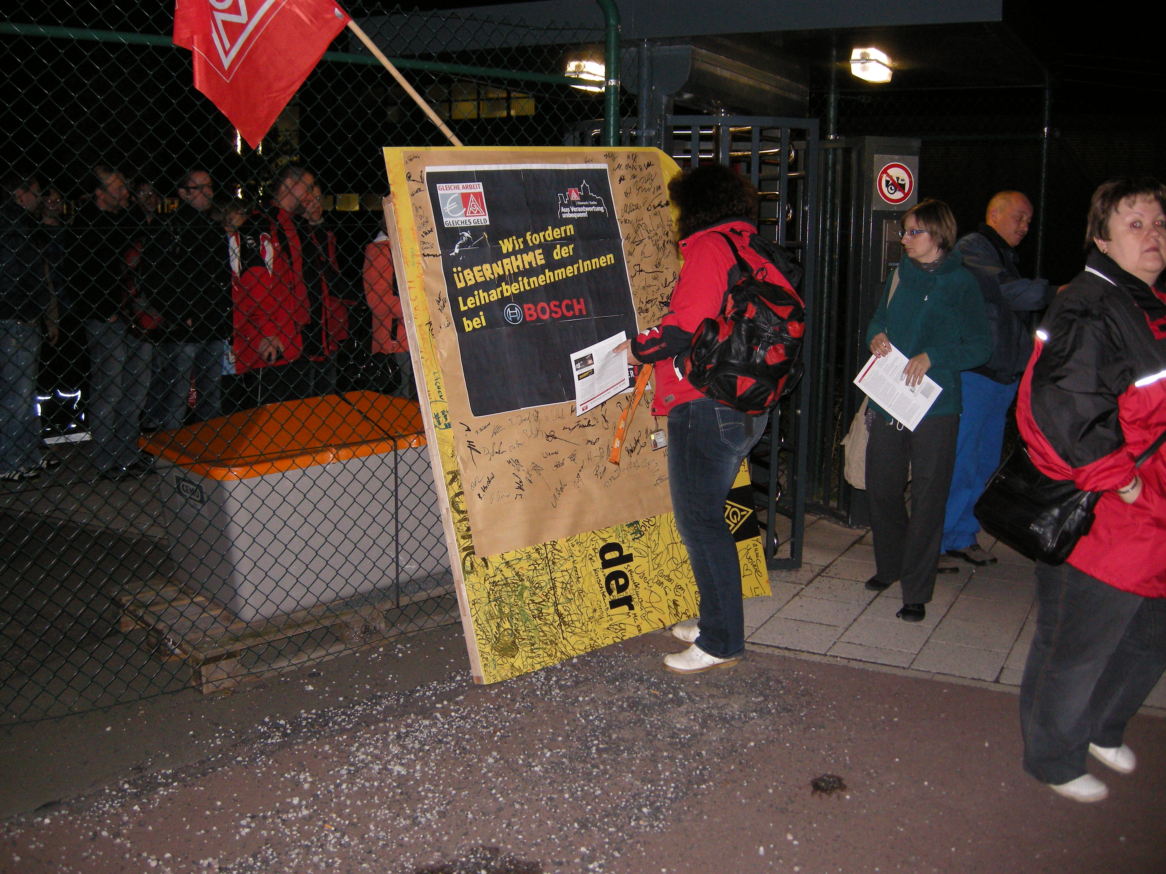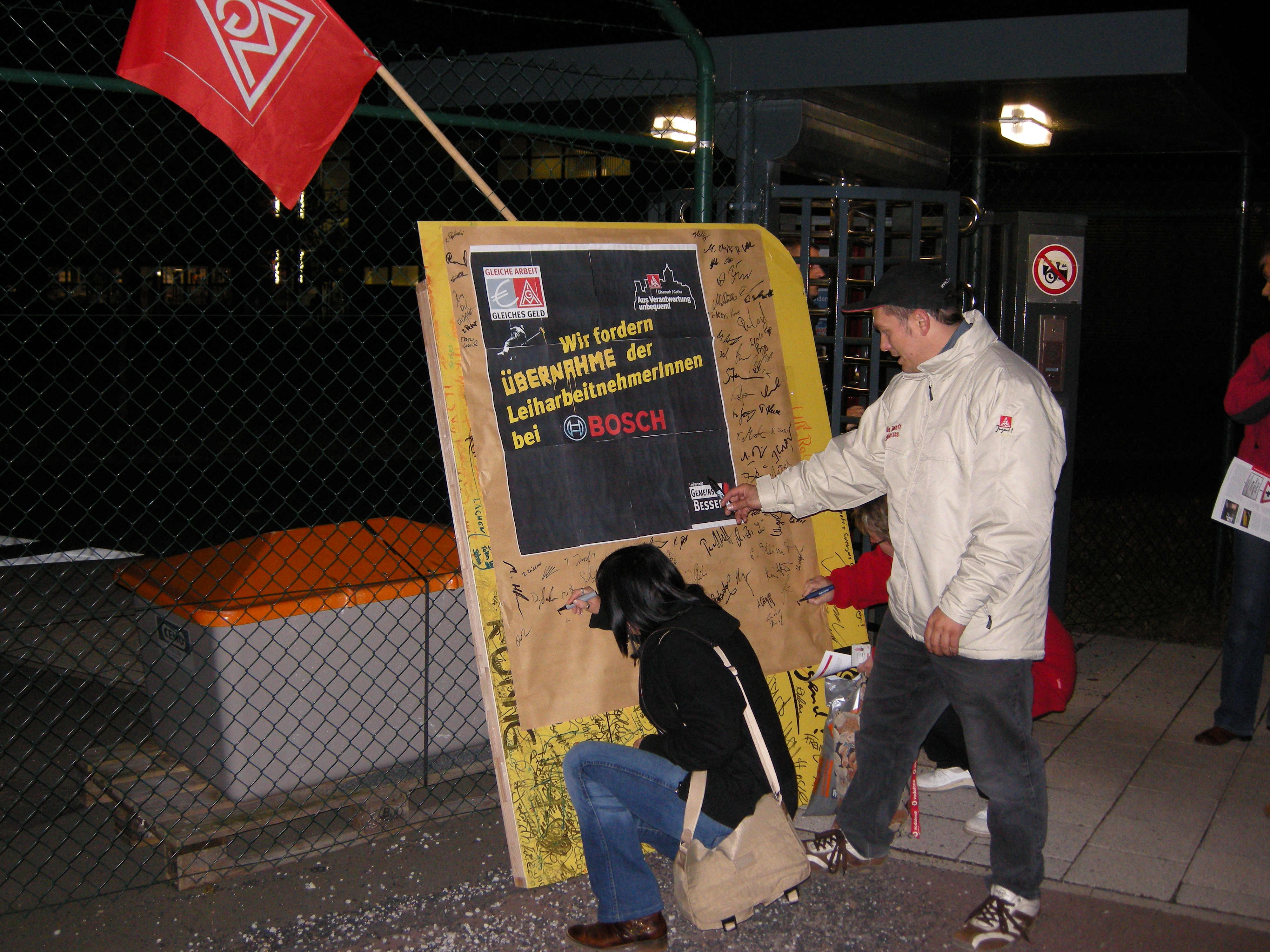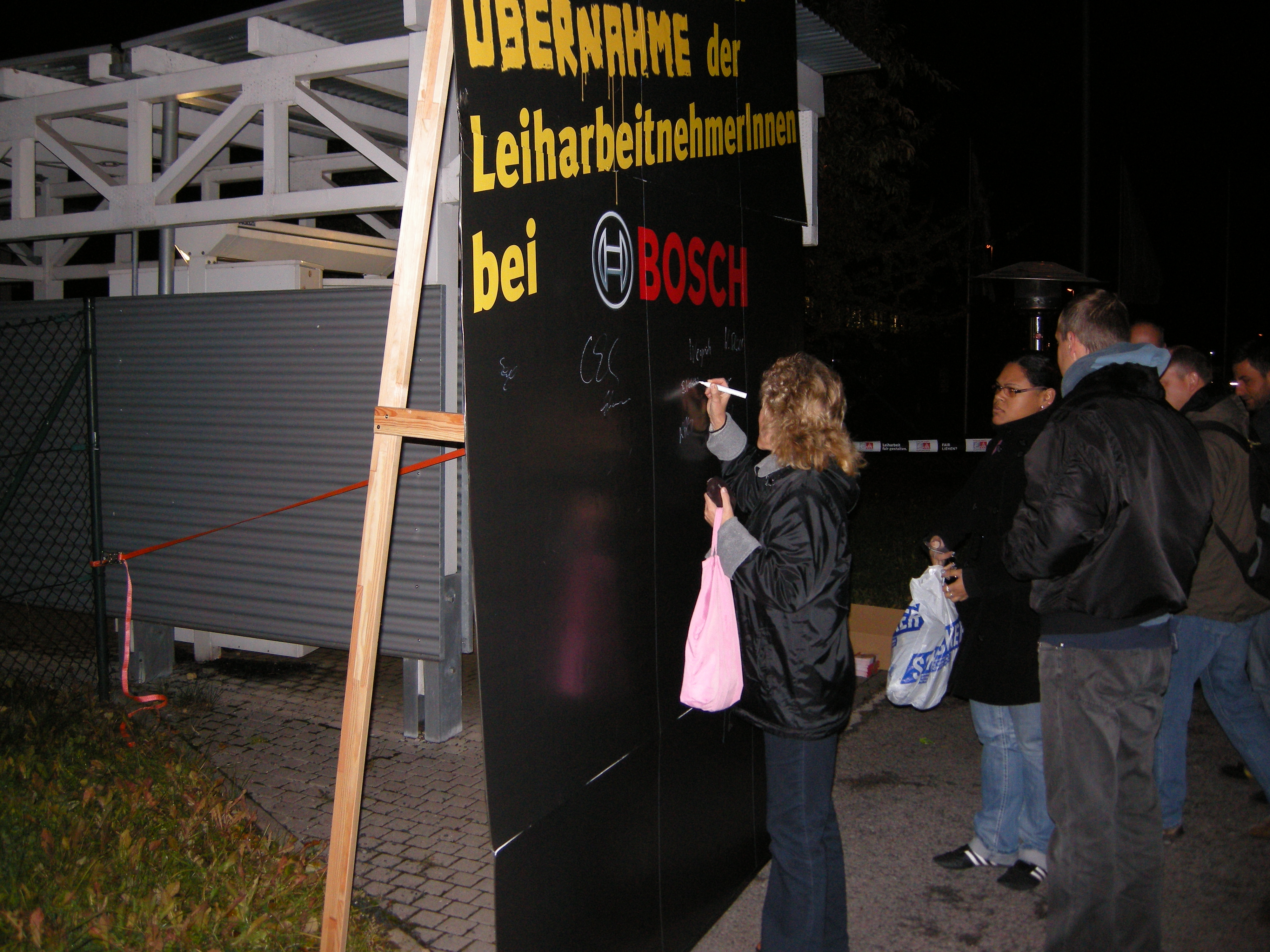 Kolleginnen und Kollegen aus dem Betrieb unterschreiben für die Übernahme von Leiharbeitnehmern
