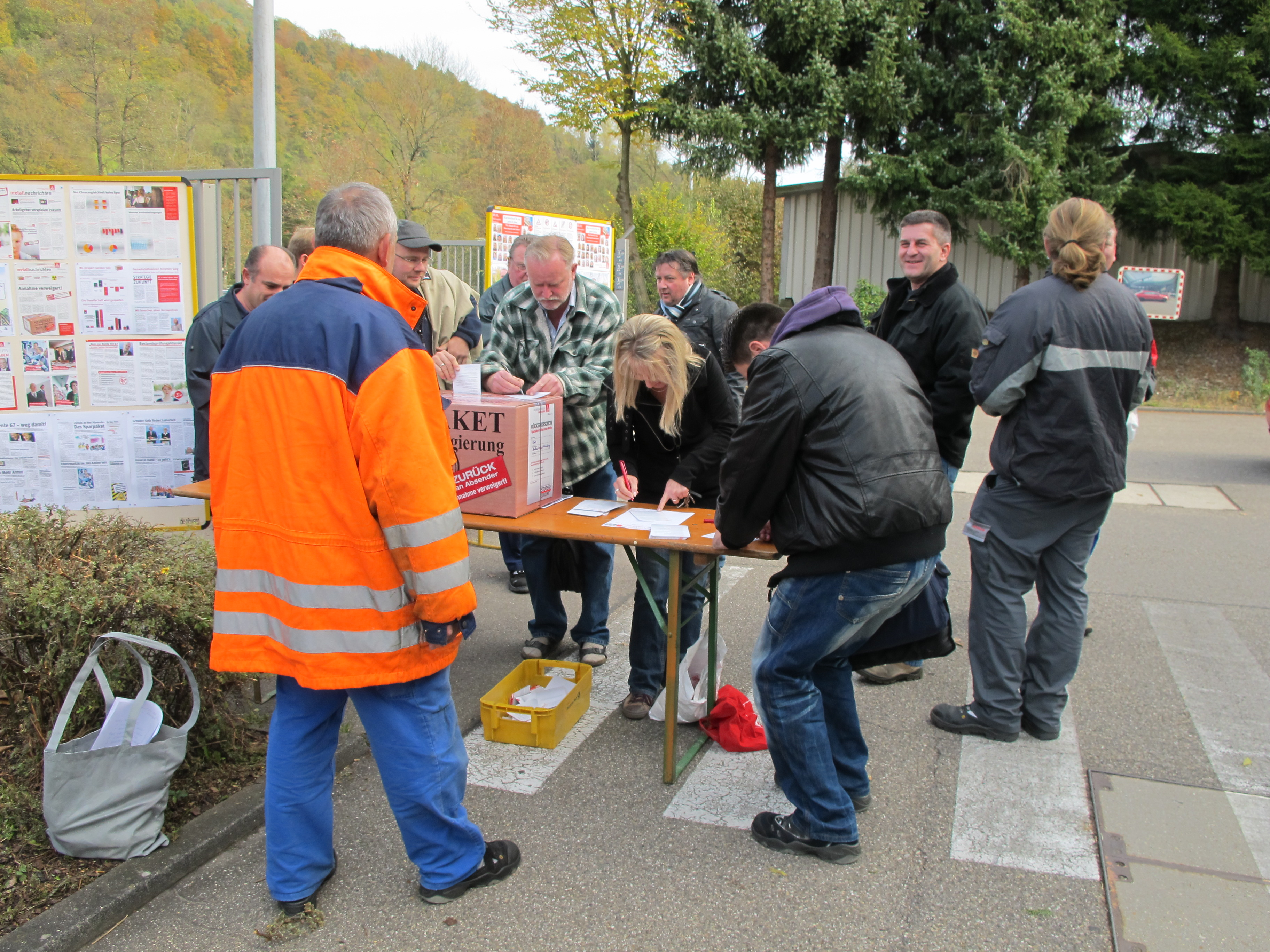 Betriebsrat und Vertrausenleute aus dem Werk informieren vor dem Werkstor.