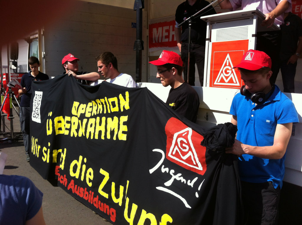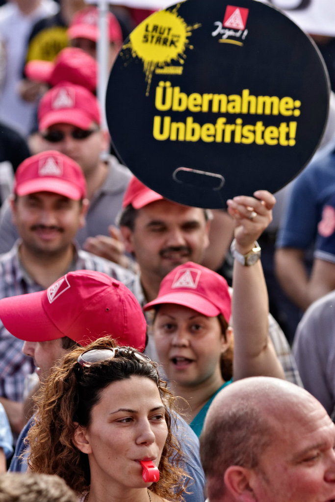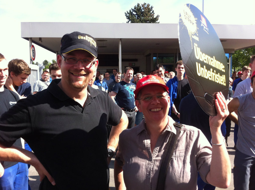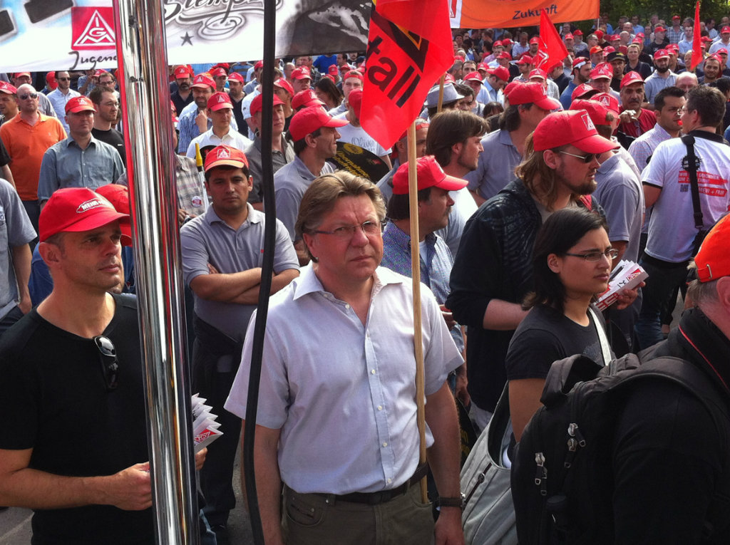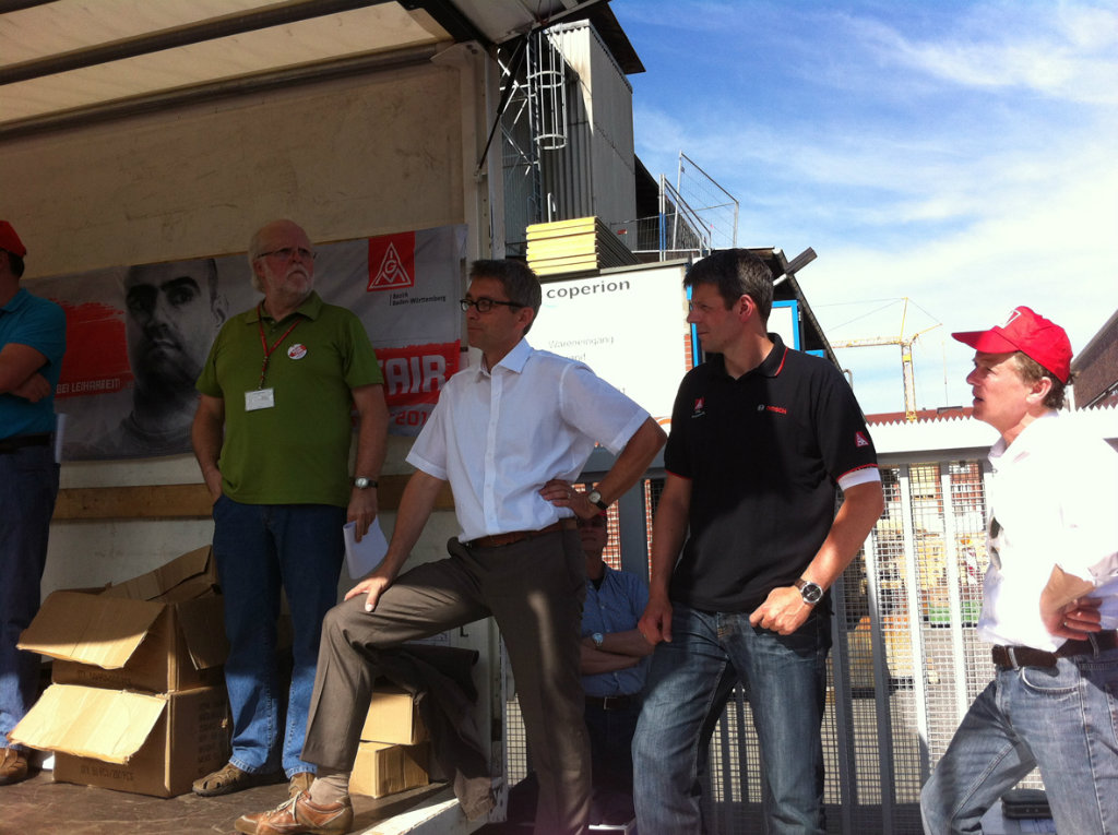 "Ohne eine tarifliche Regelung zur Leiharbeit und zur Übernahme der Azubis gibt es keine Ruhe in den Betrieben", sagte Martin Röll, Zweiter Bevollmächtigter der IG Metall Stuttgart auf der einstündigen Kundgebung. "Wir erwarten jetzt einen großen Schritt der Arbeitgeber in den Verhandlungen der Expertenkommission."