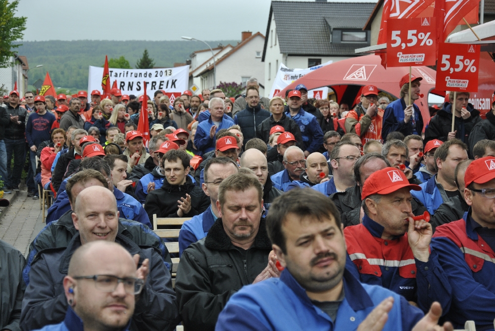 Mit großer Aufmerksamkeit folgen die Kolleginnen und Kollegen den Worten des IG Metall-Redners, der die Angebote der Arbeitgeber kritisiert.