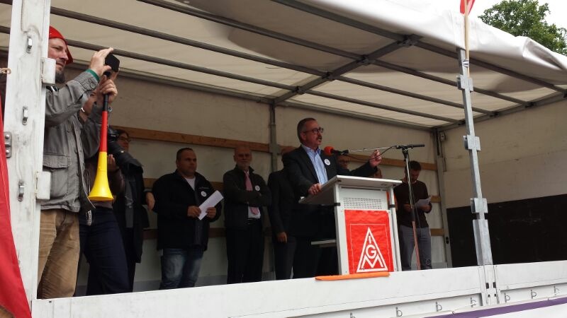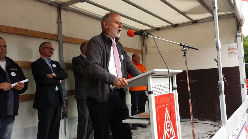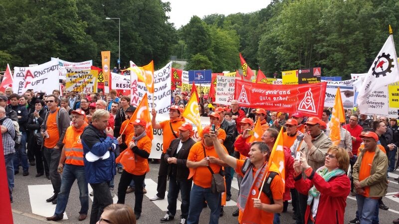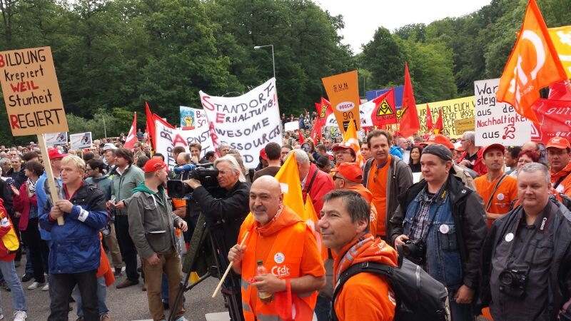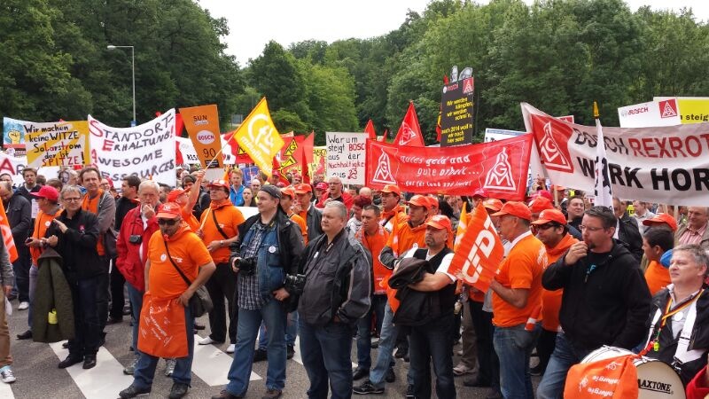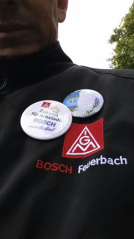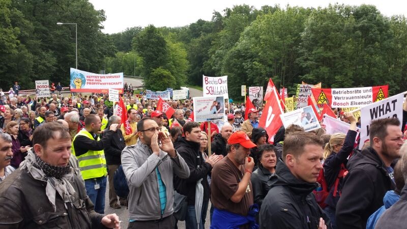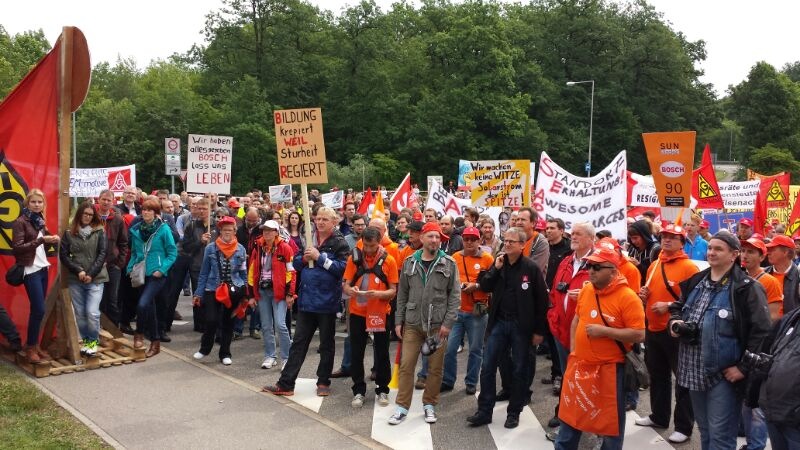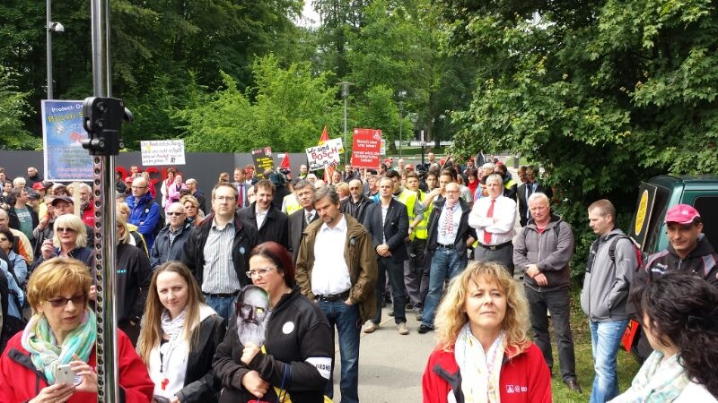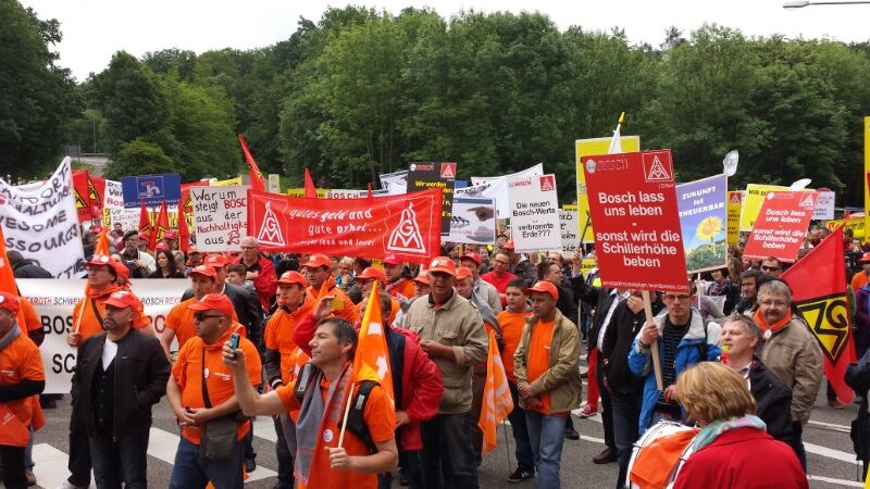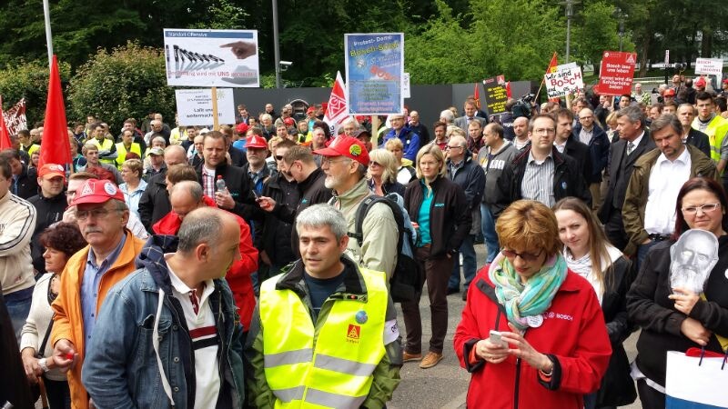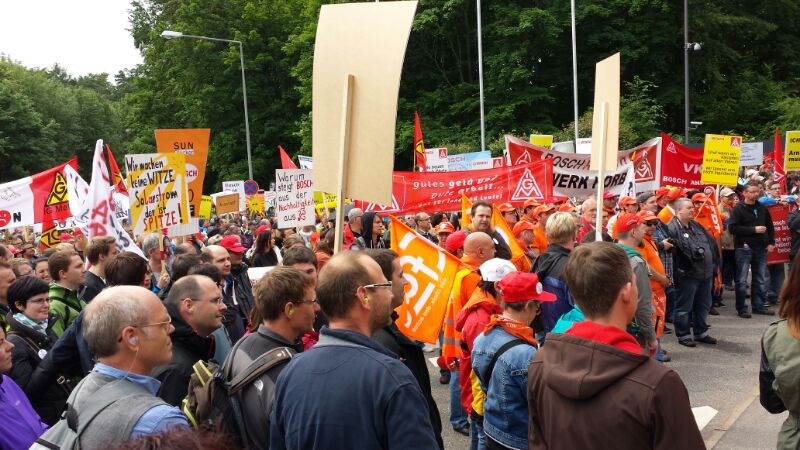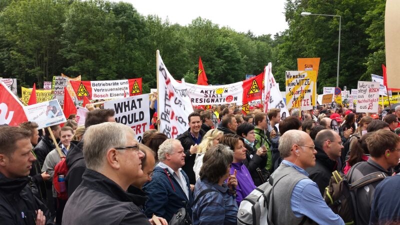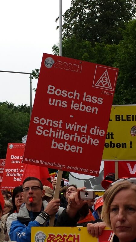 Seit Monaten kämpfen die Beschäftigten von Bosch Solar Energy in Arnstadt um ihre Arbeitsplätze. Am Donnerstag, 27. Juni 2013, fand eine Großkundgebung vor dem Haupttor der Zentrale des Bosch Konzerns auf der Schillerhöhe in Gerlingen geplant. Über 2000 Kolleginnen und Kollegen kamen - darunter auch 300 Bosch-Kollegen, die sich solidarisierten.