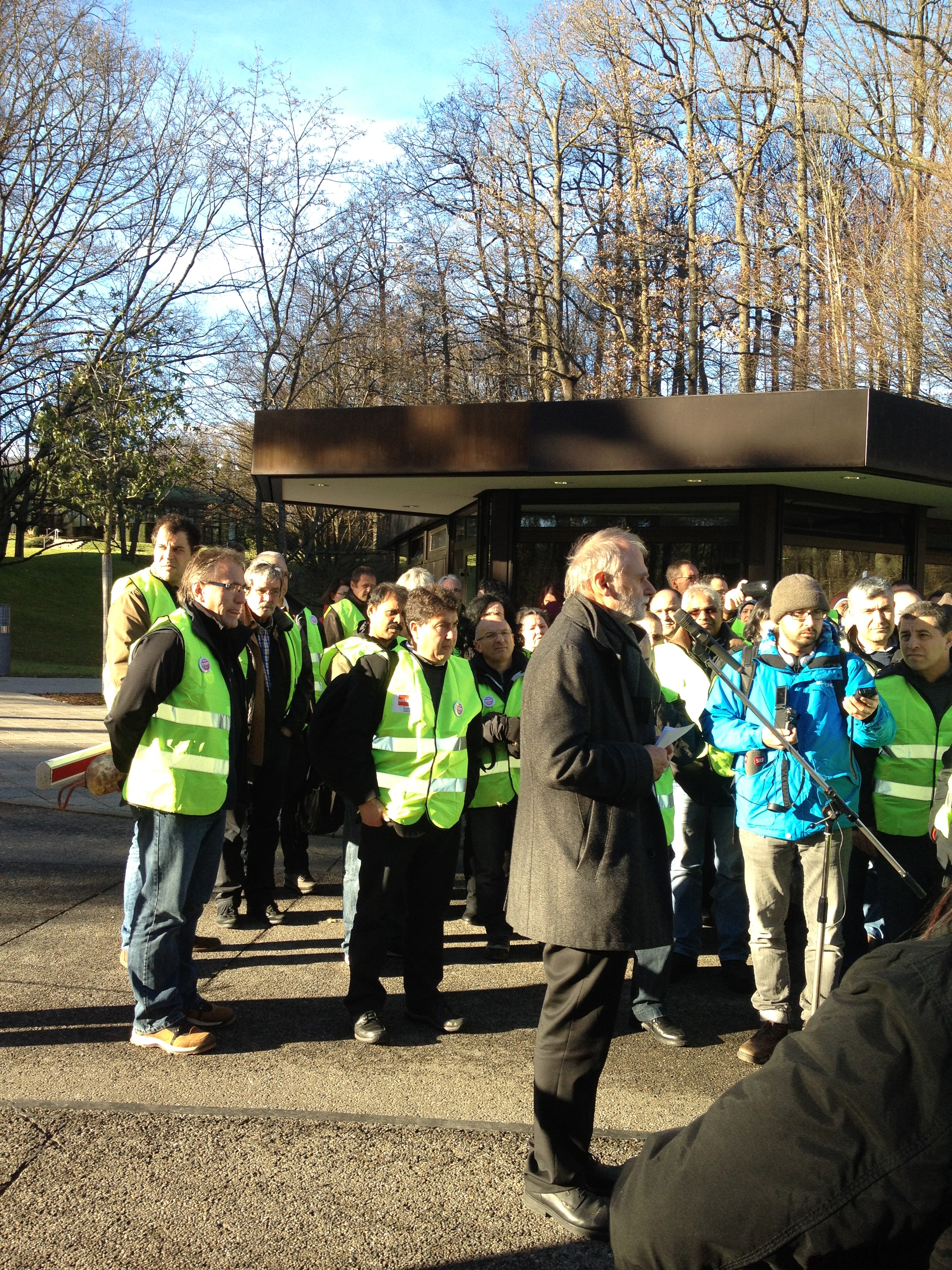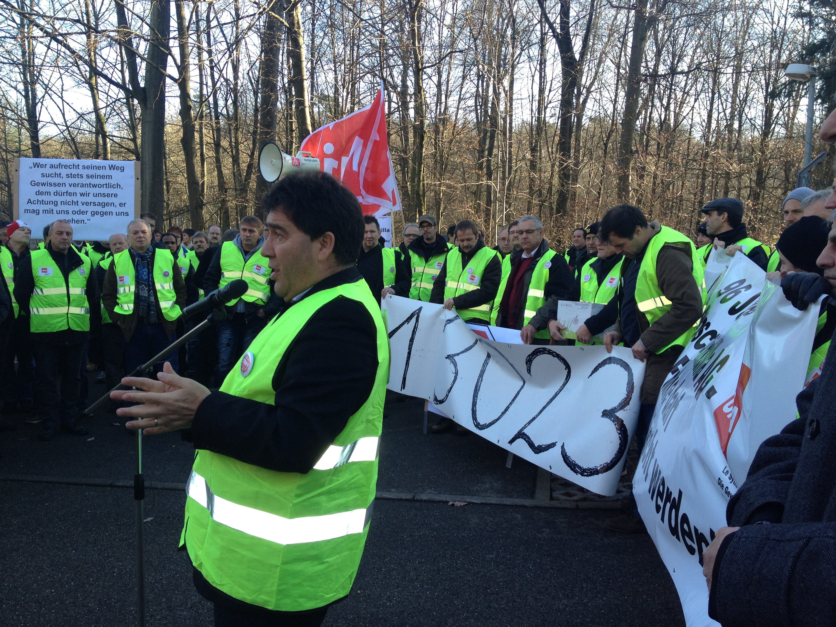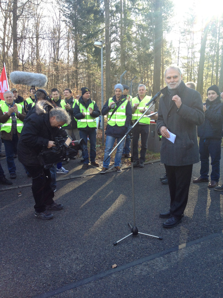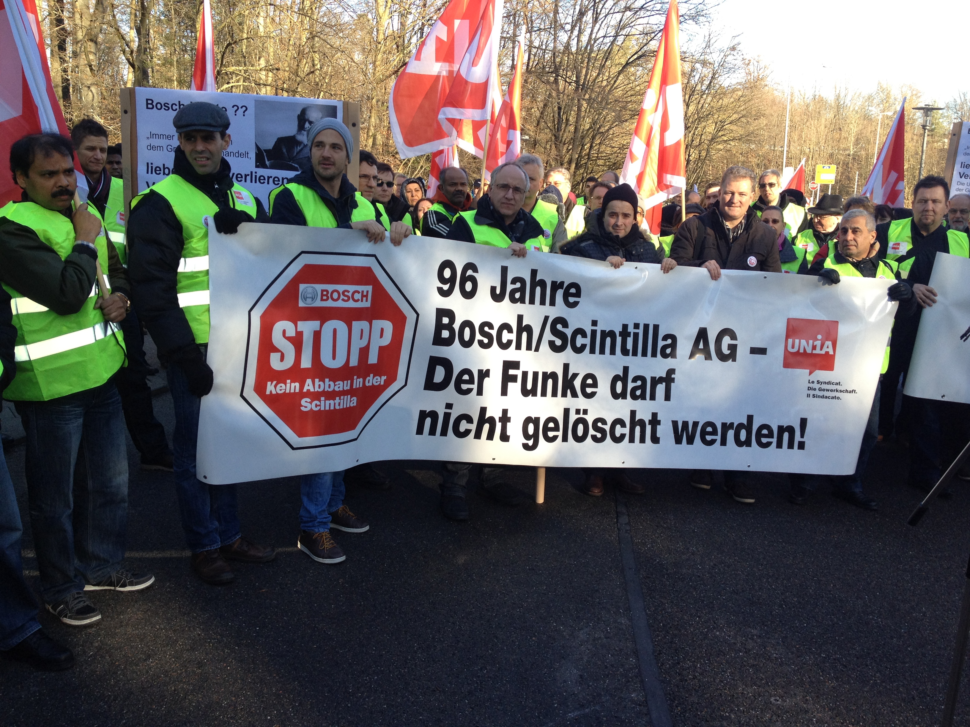 16.12.2013 Die Beschäftigten der Scintilla AG in Zuchwil/Schweiz kämpfen um ihre Arbeitsplätze. Mit Transparenten und Kuhglocken zogen heute die Mitarbeiter der Scintilla AG vor die Bosch Konzernzentrale in Gerlingen bei